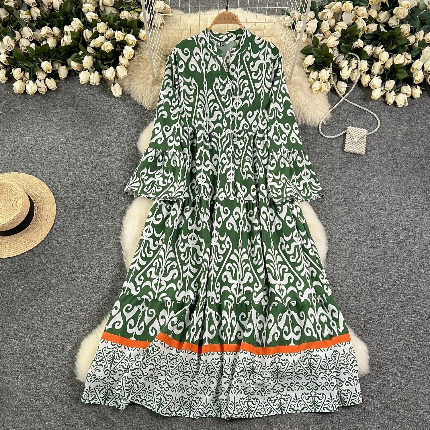 LP | Abito lungo vintage stampato con scollo a V e maniche svasate